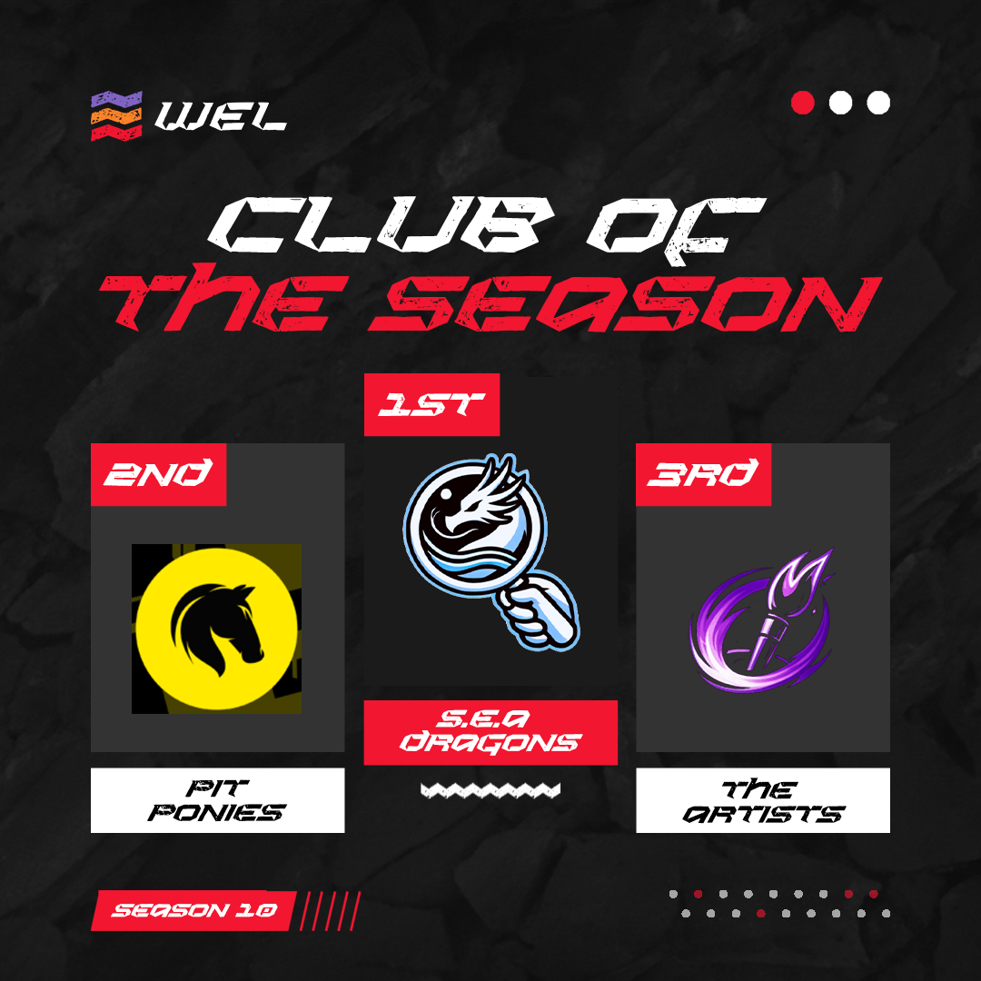 Following the victory within the final and becoming the Welsh Esports League, Rocket League Season 10 Champions, S.E.A. Dragons were also named and awarded the "Club of The Season" award for the 2nd season in a row! Marking the first time that a club has won the award as both an "affiliate" member and "full" member of the league, also becoming the second time a team has won "Club of The Season" twice in a row (after Wolfhounds in S6 and S7.)